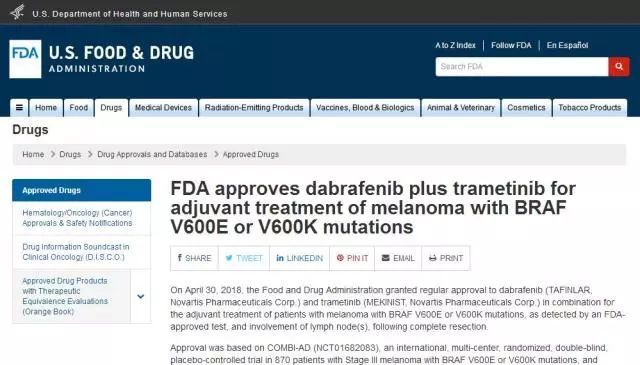 2018年4月30日,出国看病服务机构了解到美国食品和药物管理局批准dabrafenib(TAFINLAR,Novartis Pharmaceuticals Corp.)和trametinib(MEKINIST,Novartis Pharmaceuticals Corp.)联合用于辅助治疗患有BRAF V600E或V600K突变(经FDA批准的检测手段检测),且肿瘤全切后淋巴结受累的黑色素瘤患者。