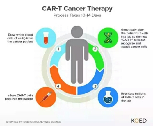CAR-T疗法是目前较为有效的恶性肿瘤的治疗方式之一。和其它免疫疗法类似,它的基本原理就是利用病人自身的免疫细胞来清除癌细胞,但是不同的是,这是一种细胞疗法,而不是一种药。“CAR-T 疗法”大致通过以下步骤进行: