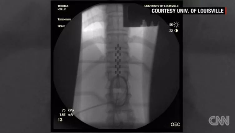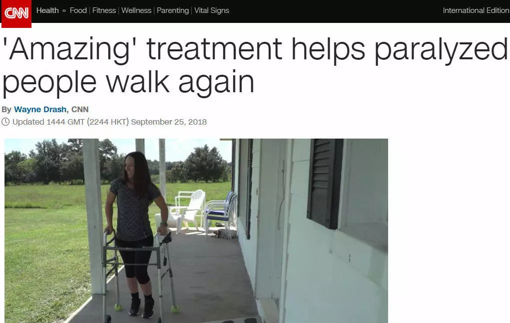 9月25日,美国有线电视新闻网(Cable News Network,CNN)健康栏目专题报道:归功于植入下背部的脊髓刺激装置(spinal cord stimulation device)和高强度的物理治疗,24岁的瘫痪患者Kelly Thomas可重新站起来行走。