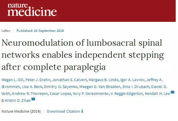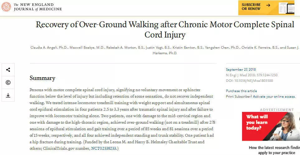 9月27日,《新英格兰医学杂志》就大篇幅报道了“四名患有“运动性完全脊髓损伤”(motor complete spinal cord injury)(这意味著在他们的损伤之下没有自主运动)的患者中有两名在被植入脊髓刺激装置后,加之高强度物理疗法,在步行器的帮助下能够再次行走”。
