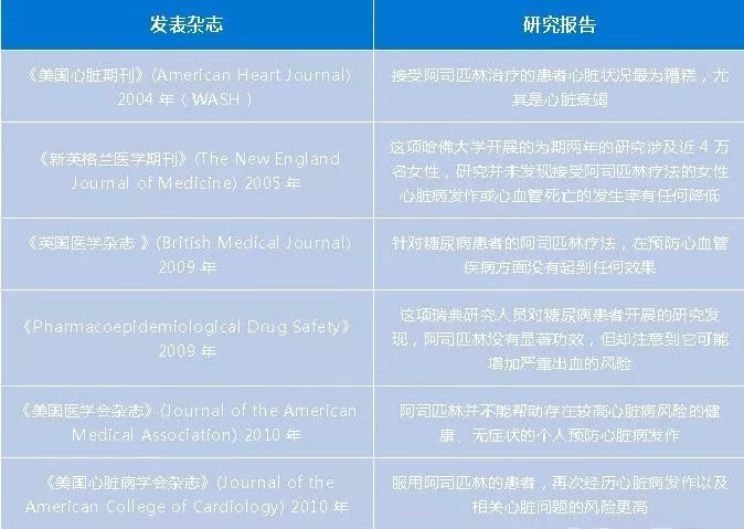 多国研究报告表明,出国看病服务机构了解到用阿司匹林预防心脑血管病的做法是一个错误。下表中列出的只是众多反对报告中的一部分。
