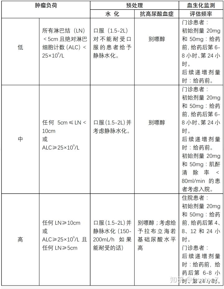(1)肿瘤溶解综合征(TLS):预处理TLS;评估所有患者的风险。给予抗高尿酸血症预处理并充分水化。随着总的风险增加,采取更加密集的措施(静脉补液,频繁监测,住院治疗)。