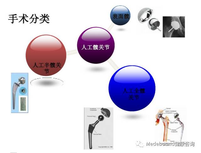 按照置换范围分为三类:全髋关节置换、股骨头置换、髋关节表面置换。