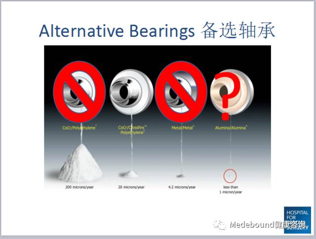 图:博斯特罗姆教授在中国的演讲稿件(美联医邦翻译):轴承材料从左至右是 1黑金 /聚乙烯; 2黑金 /高交联聚乙烯; 3金属/金属; 4氧化铝/氧化铝