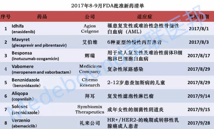 2017年八月-九月,赴美就医服务机构了解到美国FDA批准的新药共有八种。包括: