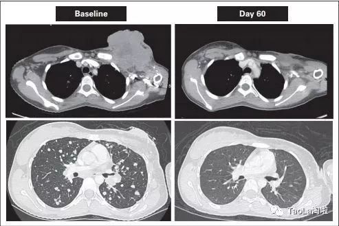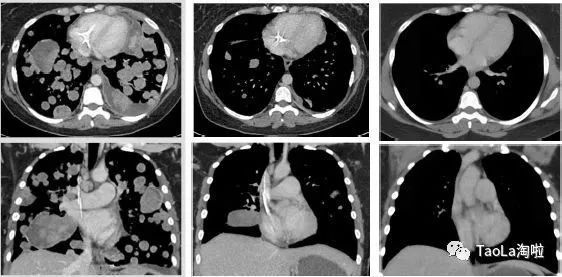 治疗后:迅速解决呼吸困难和低氧血症。2个周期后,大部分肿瘤消失,12个周期后,肿瘤组织几乎完全消失!