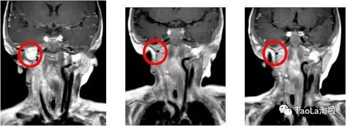 治疗后:接受抗癌药Vitrakvi成人剂量的液体制剂治疗3周期后,MRI磁共振显示肿瘤体积减少90%!