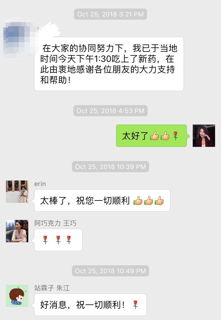 10月25日,美国时间下午1:30,美联医邦收到林先生的感谢信息,被告知他已在美国波士顿取得新药并开始服用,纷纷送上最真挚的祝福。