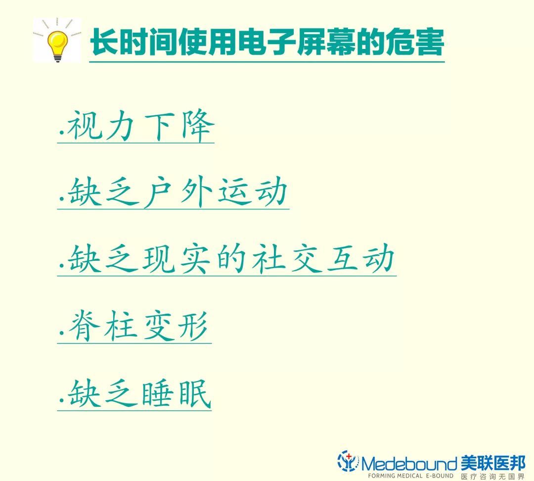 为了减少电子屏幕给孩子带来的伤害,出国看病服务机构了解到法国看病专家曾推出一项名为“3-6-9-12”的控制计划,即 3 岁前不允许看电视, 6 岁前不接触游戏机, 9 岁前不登录互联网,12 岁前不注册社交网络,12 岁后对电子屏幕产品的消费进行控制。