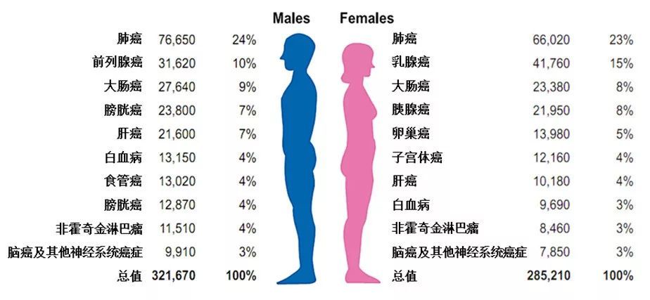 男性新发病例的前三位:前列腺癌、肺癌和大肠癌。女性中最常见的癌症将是乳腺癌、肺癌和大肠癌,约占全部新发病例的一半。