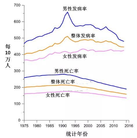肺癌男性发病率的下降速度是女性的二倍,这可能是男女吸烟/戒烟差异导致的。