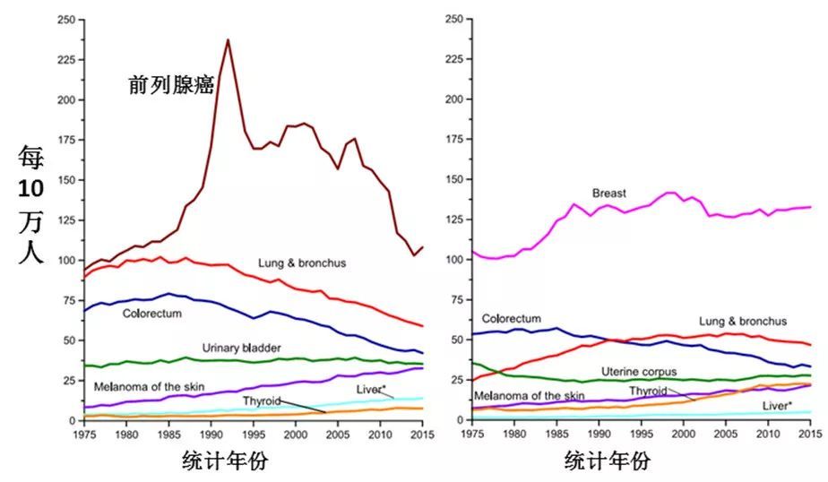 美国看病服务机构指出,从2011年到2015年,肺癌和大肠癌发病率每年下降约3%,前列腺癌发病率每年下降约7%——这归因于前列腺特异性抗原(PSA)筛查技术的推广。而女性的癌症发病率在过去数十年间保持稳定。