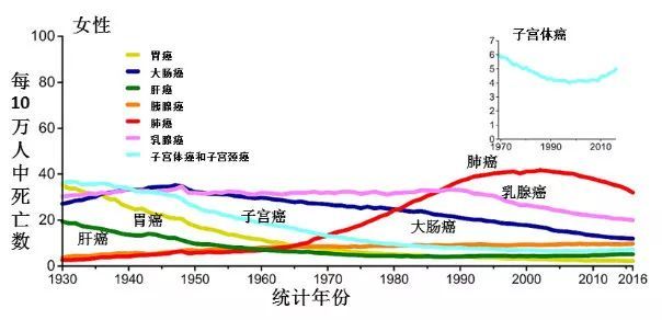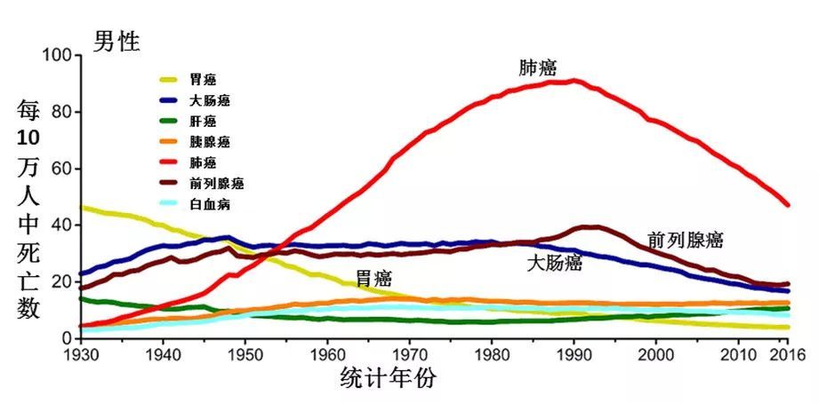 20世纪美国癌症死亡率的上升主要是由于大量吸烟导致的男性肺癌死亡人数攀升。