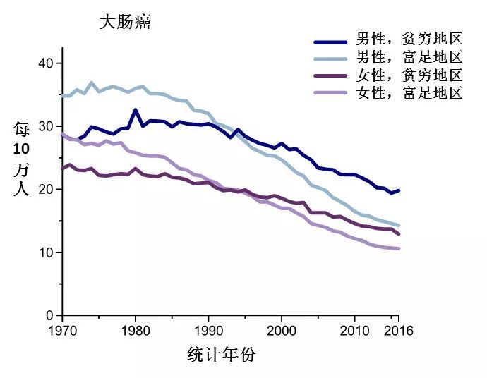 经济实力差异在大肠癌死亡率变化中体现得最为显著: