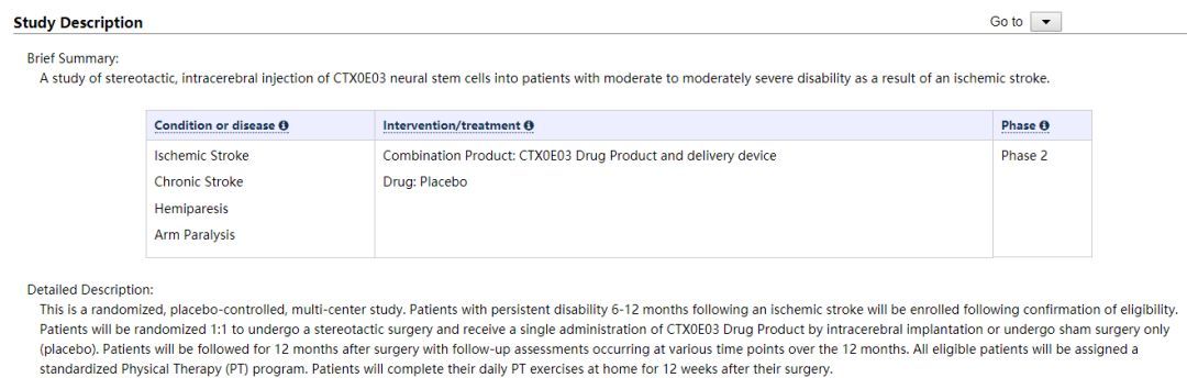 如今,同类研究得到进一步发展!2018年底,美国食品药品监督管理局(FDA)批准一项名为:立体定向术、脑内注射CTX0E03神经干细胞治疗缺血性卒中所致中重度残疾患者的研究。