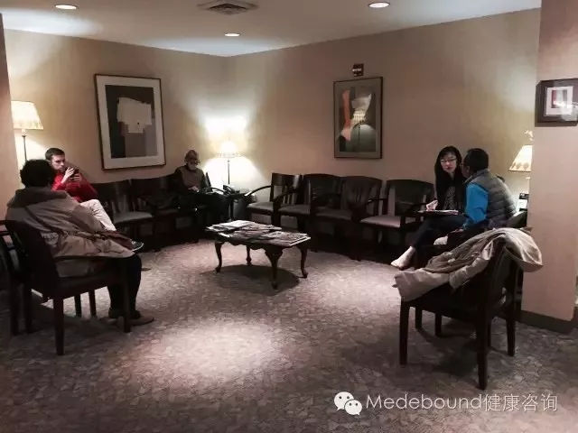 诊所内的等候区:客户(右1)和陪同翻译(右2)正在交流和就诊前填写病史表